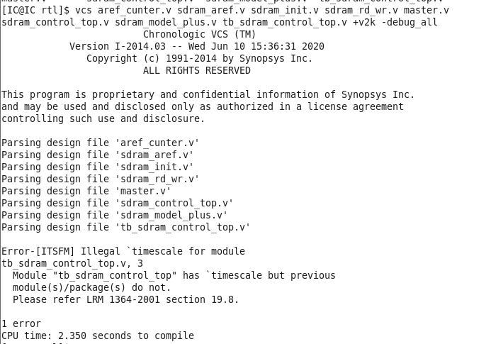 第一张图里面我对多个模块的.v文件进行编译,顺序是aref_cunter.v sdram_aref.v sdram_init.v sdram_rd_wr.v master.v sdram_control_top.v sdram_model_plus.v tb_sdram_control_top.v,timescale 只在tb_sdram_control_top.v文件中写了,其他都没有写,然后发现vcs编译报错,报告的错误为
