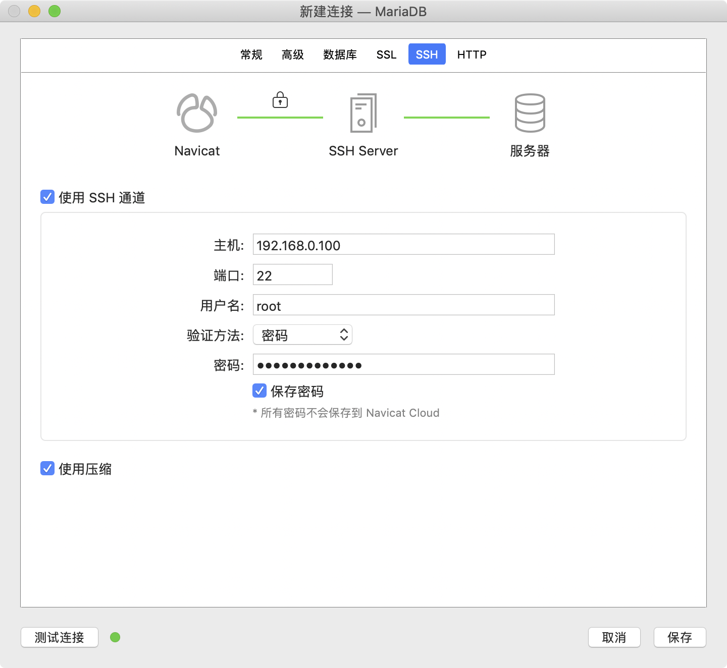 查了好多资料无果,还有很多说改这个改那个配置,无奈对这些又不懂,于是群友Jason给出新招:先将主机名改成localhost,输入数据库的用户名和密码,再点开SSH,设置好主机IP、端口,这里的用户名root和密码用的是Linux的root用户登录系统的密码,不是数据库的密码,设置完再连接测试,成功!