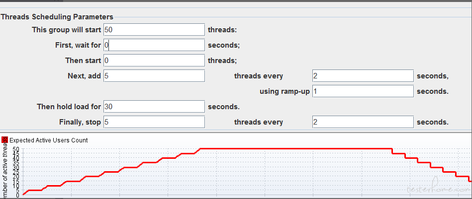 then hold load for:线程全部加载完之后运行多长时间,如图:设置为 50 秒,表示最后 200 个线程加载完之后再持续 50 秒