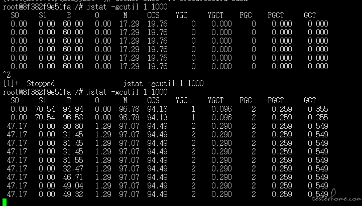 jstat -gcutil 1 1000 观察一下内存 gc 的情况