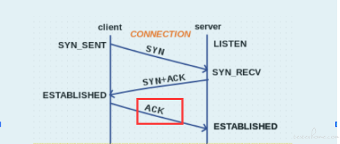 服务器端一直等到接收到 ACK 之后,状态才变为 ESTABLISHED