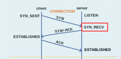 服务器收到 SYN 报文后会回复 SYN+ACK 报文。既确认了客户端的序列号,也把自己的序列号发给客户端。此时服务端状态是 SYN_RECV。这个状态下,服务端必须建立一个 SYN 半连接队列来维护未完成的握手信息,当这个队列溢出后,服务器将无法再建立新连接。