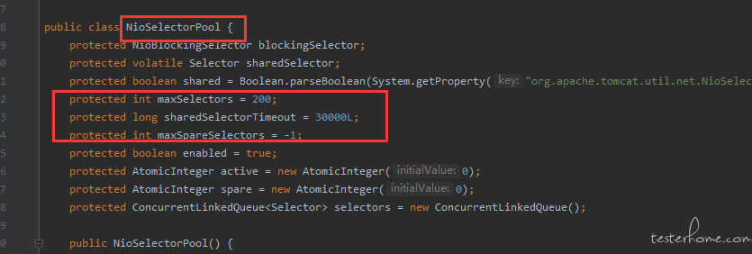 重点关注NioEndpoint这个,NIO 是 tomcat 的一种 IO 模式,定位到源码层面,可以看到一些关于 tomcat 线程池的配置