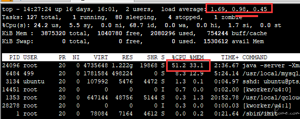 一分钟平均负载只有 1.6,cpu 利用率 50%。负载低,利用率也低