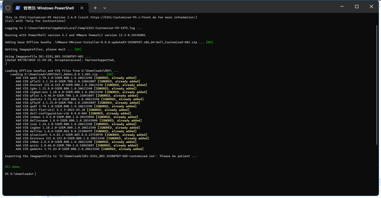 .\ESXi-Customizer-PS-v2.6.0.ps1 -iZip .\VMware-VMvisor-Installer-8.0.0.update03-24280767.x86_64-Dell_Customized-A02.zip -pkgDir D:\Downloads\DRV\