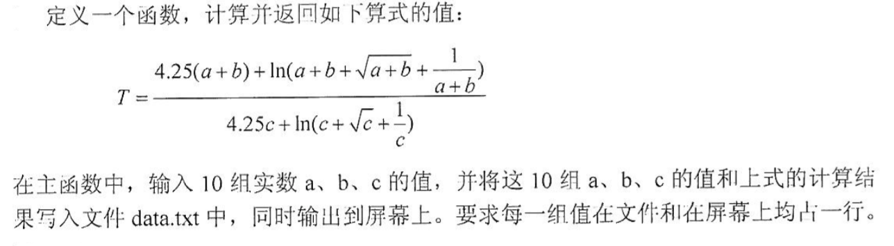 #include<stdio.h> #include<math.h> float hs(int a,int b,int c){ float s; s=(4.25*(a+b)+log(a+b+sqrt(a+b)+1/(a+b)))/(4.25*c+log(c+sqrt(c)+1/c)); return s; } int main(){ int a,b,c; float m; FILE *fp=fopen("data.txt","w+"); if(fp==0) printf("erreo"); for(int i=0;i<10;i++){ printf("请输出第%d组abc的值\n",i+1); scanf("%d%d%d",&a,&b,&c); float hs(int a,int b,int c); m=hs(a, b, c); printf("%f\n",m); fprintf(fp,"T%d=%f\n",i+1,m); } fclose(fp); return 0; }