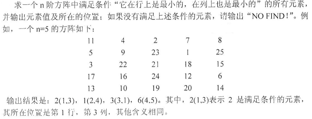 1 #include<stdio.h> 2 int main(){ 3 int a[5][5]={{11,4,2,7,8},{5,9,23,1,25},{3,22,21,18,15},{17,16,24,12,6},{13,10,19,20,14}};//定义如图所示的二维数组 4 5 int i,j,k; 6 for(int j=0;j<5;j++){ 7 int flag=1; 8 int m=0,n=0; 9 k=a[0][j];//先定住一列,进行行循环 ,遍历出一列上最小值 10 for(int i=1;i<5;i++){ 11 if(a[i][j]<k){//只要这一列上有比初值小的,即把小值赋给k 12 k=a[i][j]; 13 m=i;//把遍历出的最小值的行项赋给m 14 n=j;//把遍历出的最小值的列项赋给n 15 } 16 } 17 for(int j=0;j<5;j++){ 18 if(a[m][j]<k){//模拟上一个for循环找到的值为k,定住这一行进行列循环判断,只要不是这一行最小 19 flag=0;//把0赋给flag 20 } 21 } 22 if(flag)//仅输出flag为真的数组 23 printf("%d(%d,%d)",k,m+1,n+1); 24 } 25 return 0; 26 }