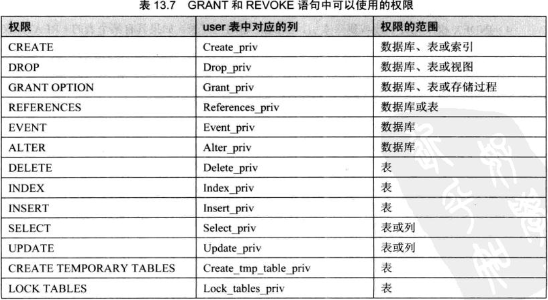 Table_priv表示对表的操作权限包括Select、Insert、Update、Delete、Create、Drop、Grant、References、Index和Alter。