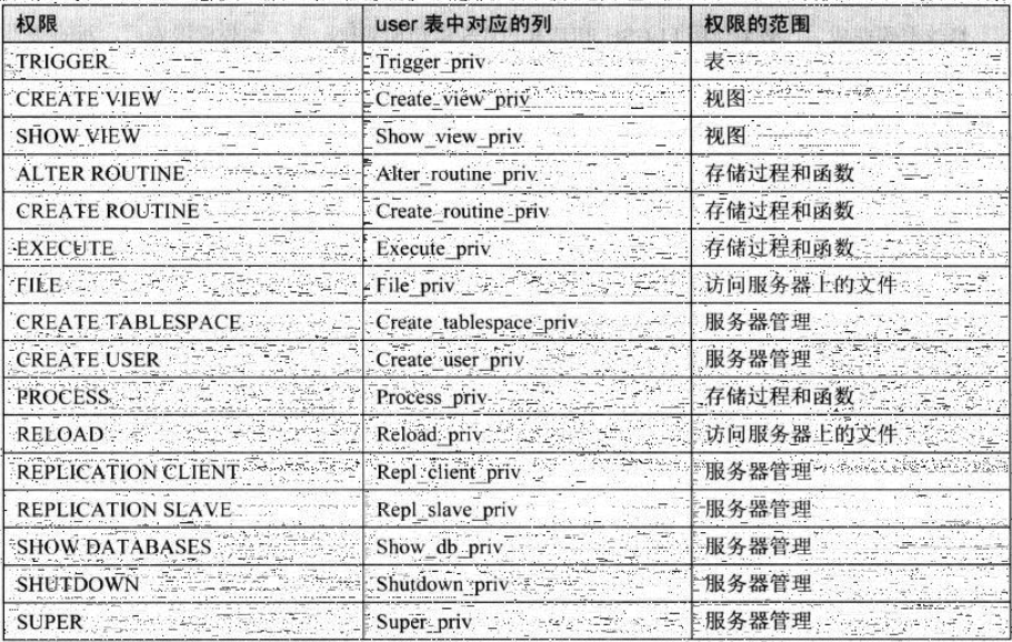 user表中对应的权限是针对所有用户数据库的。这些字段值得类型为ENUM,可以取的值只能为Y和N,Y表示该用户有对应的权限;N表示用户没有对应的权限。
