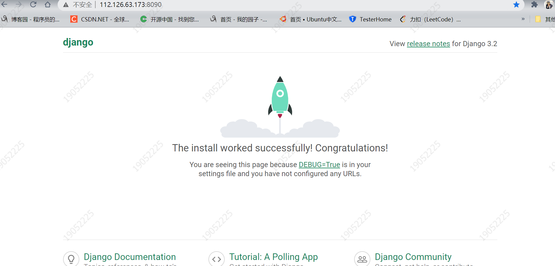 [root@iZ2zefxnyg4hmvlbog2p5mZ ~]# python3 manage.py runserver 0:8090 ---8090 为开放的端口 Watching for file changes with StatReloader Performing system checks... System check identified no issues (0 silenced). June 01, 2021 - 10:36:02 Django version 3.2.3, using settings 'hhc_blog.settings' Starting development server at http://0:8090/ Quit the server with CONTROL-C.