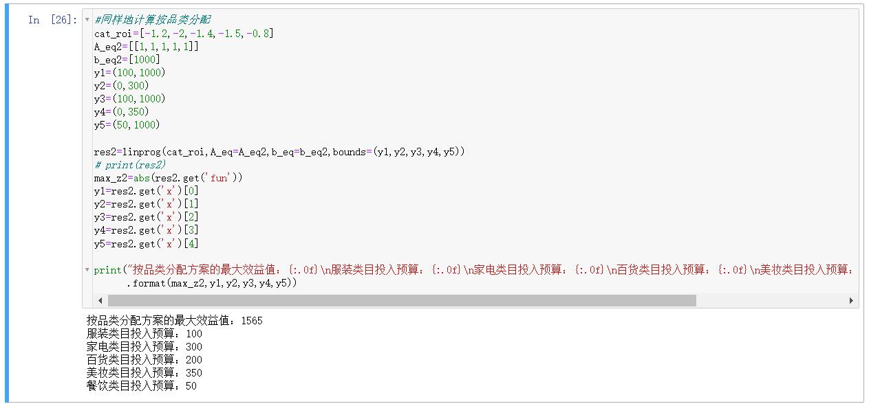 c是线性目标函数系数,我们的目标函数是z=roi*投入预算,则c即roi,写作列表[-1.5,-2,-0.7,-001]
