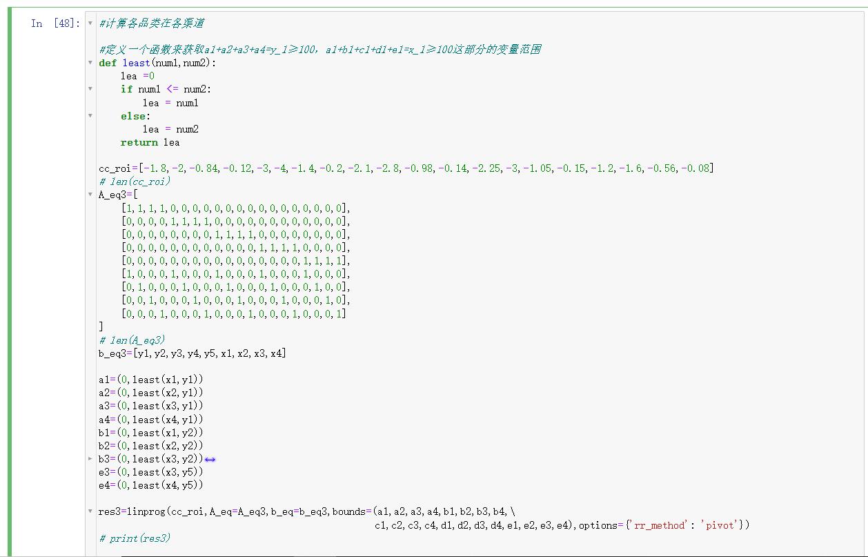 这里遇到个问题,因为品类渠道的A_eq矩阵是奇异矩阵(20列9行),虽然能出结果但不是最优的,经过各种百度最后找到原因是被函数判断成冗余了,