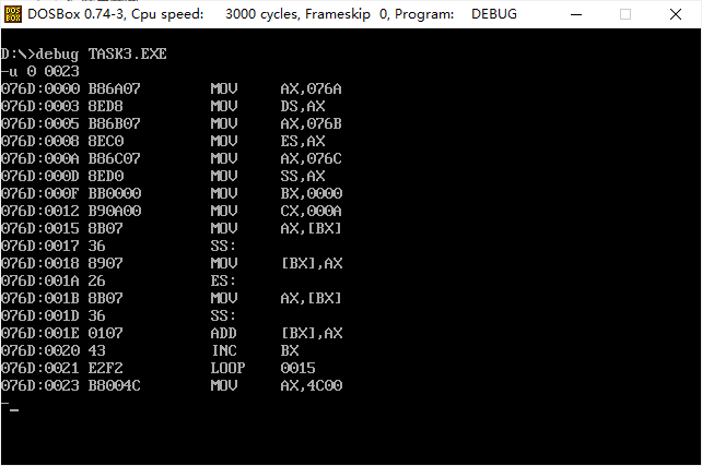 ①在debug中将执行到line17结束、line19之前,记录此时:寄存器(DS)=076A,寄存器(SS)=076B,寄存器(CS)=076C