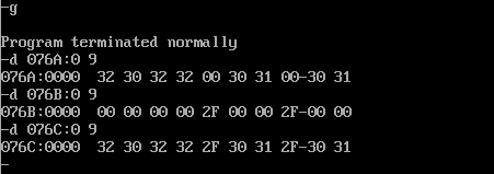 使用debug工具具对程序进行调试,使用g命令一次性执行到程序返回前(即ine25执行之后、line27 执行之前)的截图