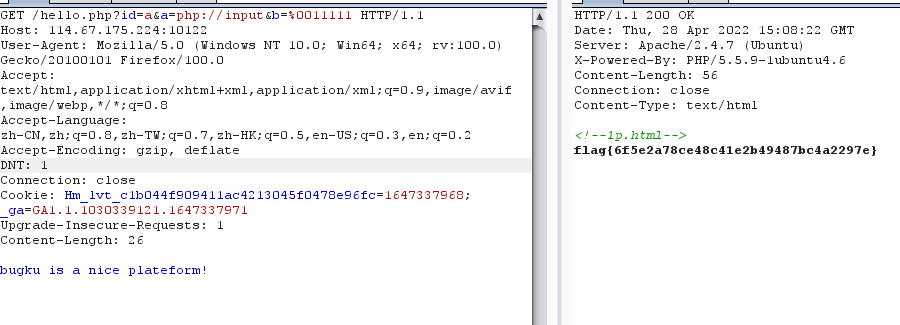 ";if(!$_GET['id'])//如果id=0或无法通过get获得id变量{ //header() 函数向客户端发送或更改原始的 HTTP 报头 header('Location: hello.php?id=1');//跳转到hello.php文件且设置id=1exit(); } $id=$_GET['id']; $a=$_GET['a']; $b=$_GET['b']; if(stripos($a,'.')){ //$a文件中不能有.echo 'no no no no no no no'; return ; } $data = @file_get_contents($a,'r'); //把整个文件读入一个字符串中 if($data=="bugku is a nice plateform!" and $id==0 and strlen($b)>5 and eregi("111".substr($b,0,1),"1114") and substr($b,0,1)!=4) { //弱类型比较 //b的长度大于5 //eregi截断漏洞 require("f4l2a3g.txt"); } else { print "never never never give up !!!"; } ?>