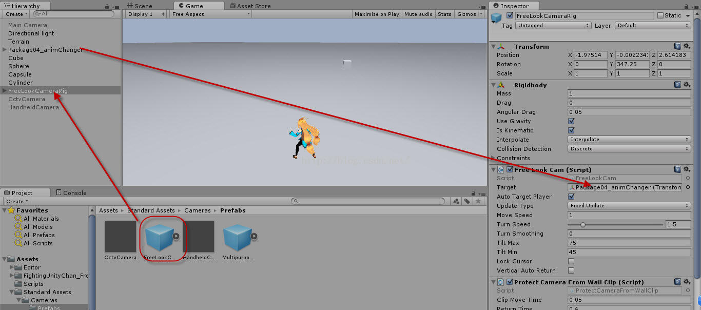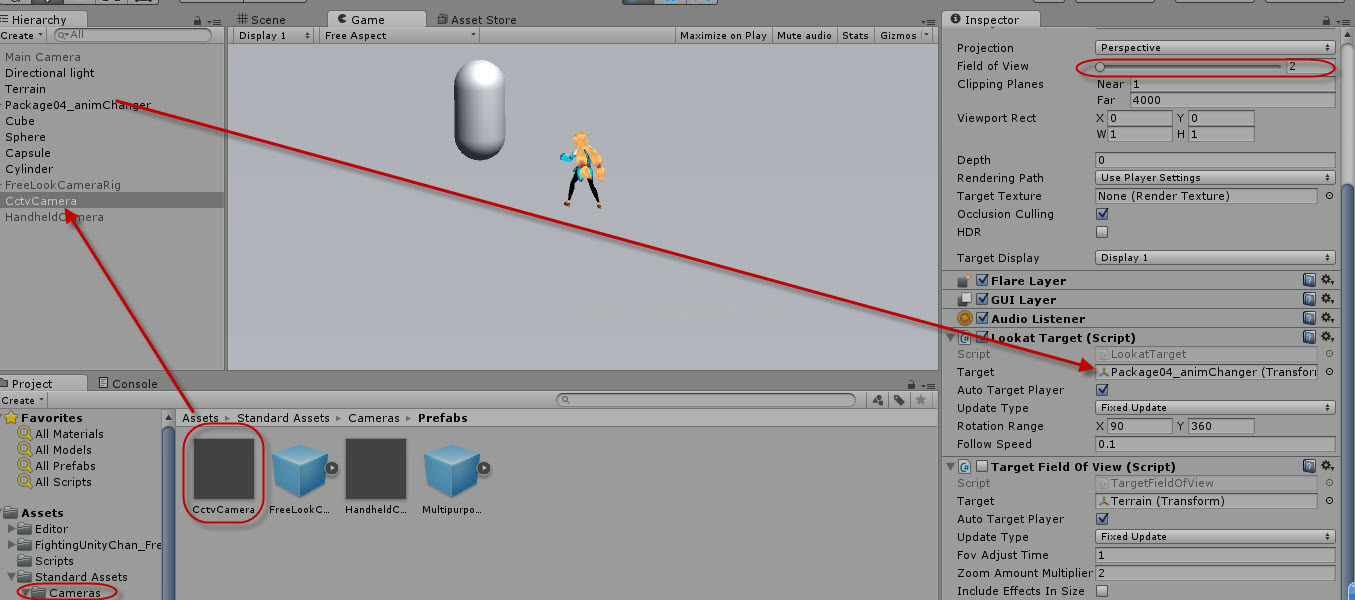 将预制件拖到场景,位置会自己去定,将对象拖到Target里,可以通过FreeLookCameraRig的孙子对象的Field View来控制对象显示的大小,相当于在调整焦距。
