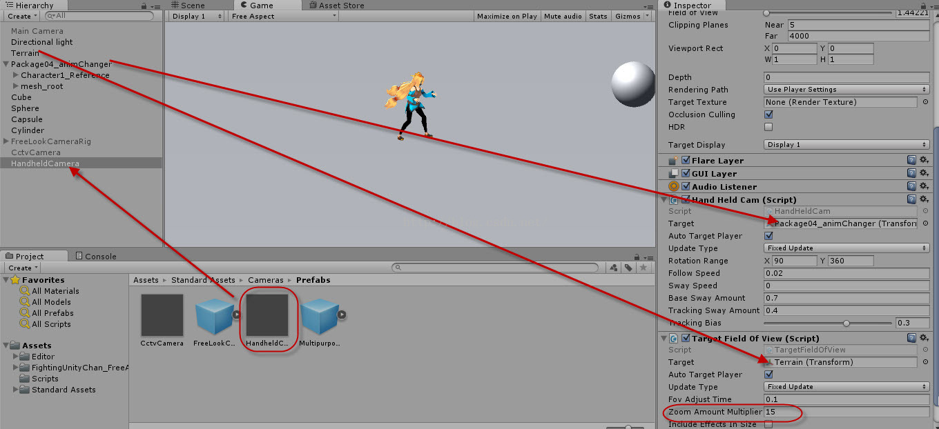 将预制件拖到场景,位置会自己去定,将对象拖到Target里,可以通过Zoom Amount Multiplier来调整最初的焦距。