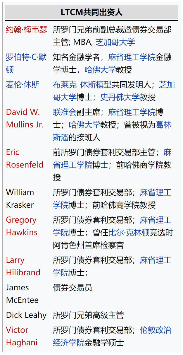 下图是维基百科介绍的LTCM的主要组成人员,绝对是顶级的华尔街精英了,里面还有两位诺贝尔经济学奖得主,论智商,经验,人脉等标准,他们都应该是收割全世界韭菜的大镰刀,但最终却遭此大败。在维基百科介绍中提到,LTCM的操作长期的确可以盈利,但因为承受了极高的杠杆,导致他们无法经受短期的金融波动,这些波动最终会在杠杆的威力下将他们压垮。