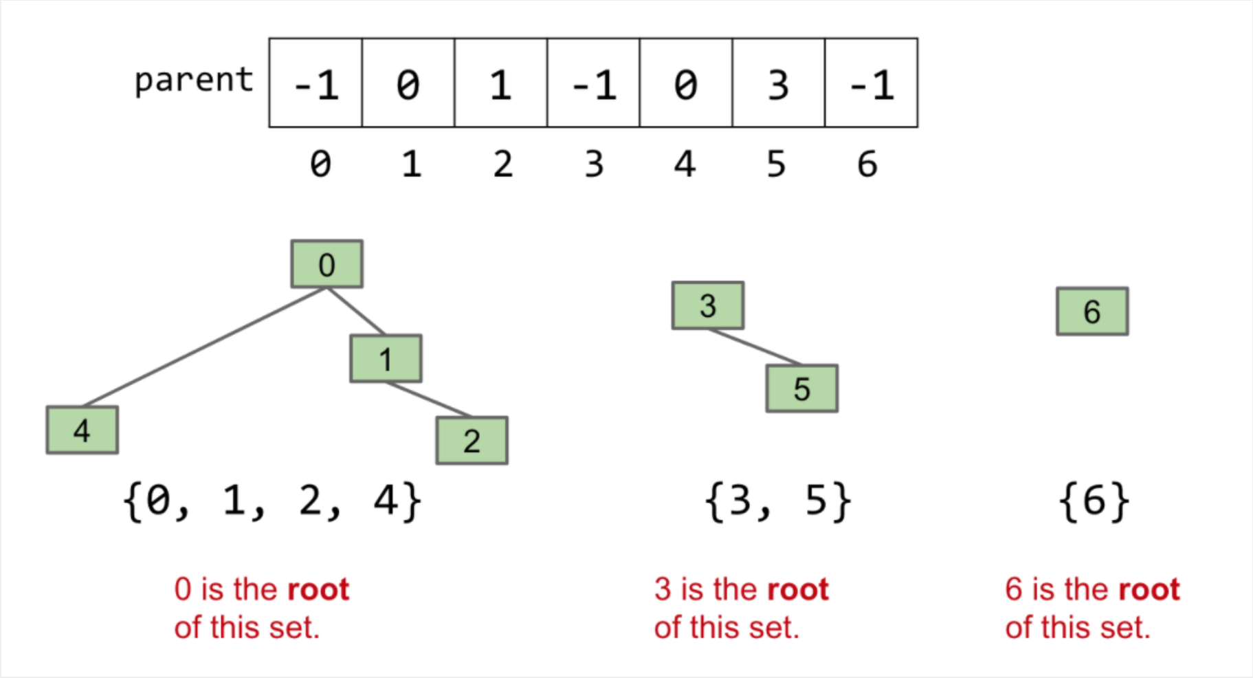 以{0, 1, 2, 4}为例:数组的索引即代表存储的每一个数据,4的父节点是0,因此索引4的值0;2的父节点是1,因此索引2的值1;0是根节点没有父节点,因此以一个负数表示(这里取-1)