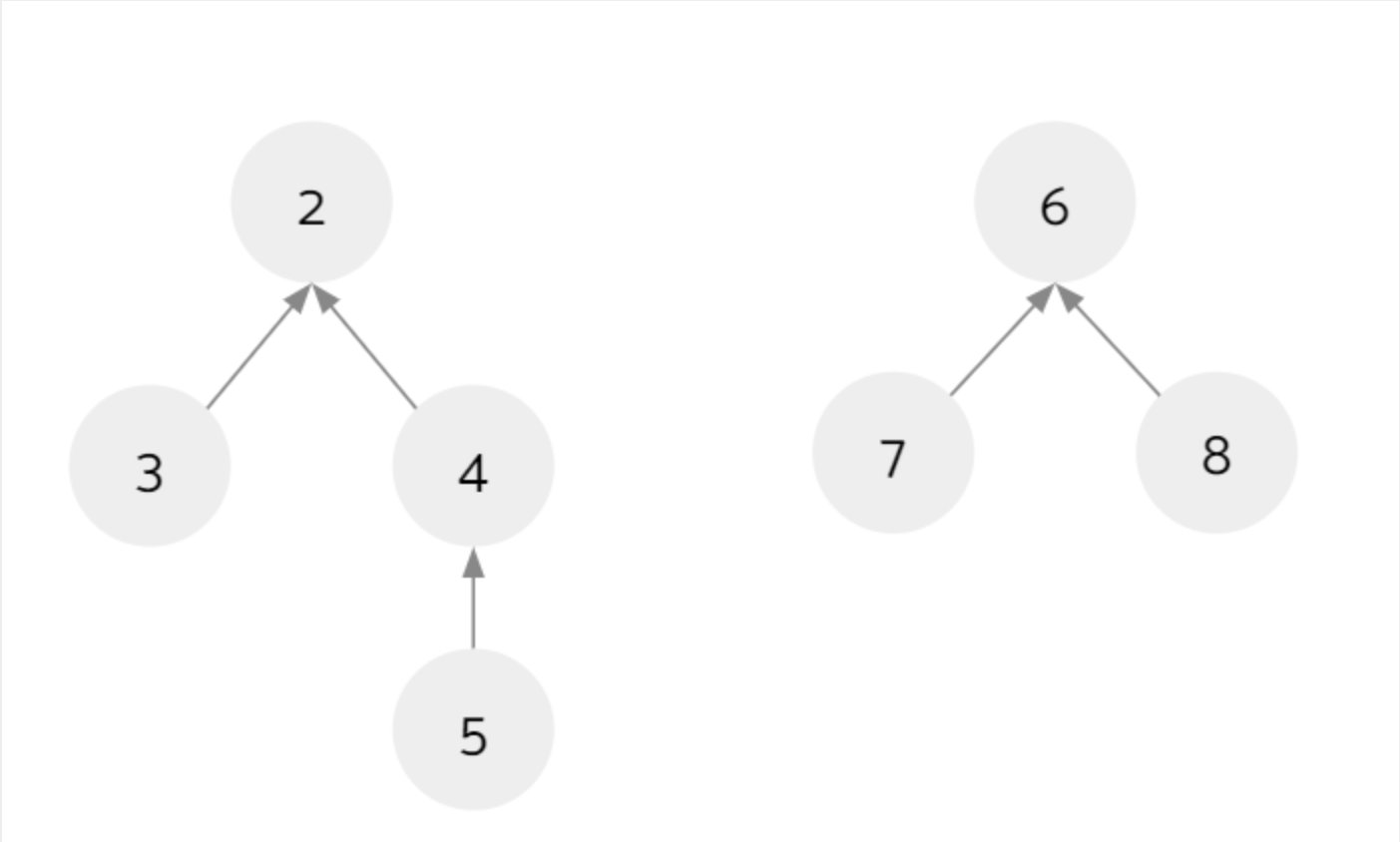 (2)若要将p和q所在的集合进行合并时,将某一棵树的根节点挂到另一棵树的根节点上。