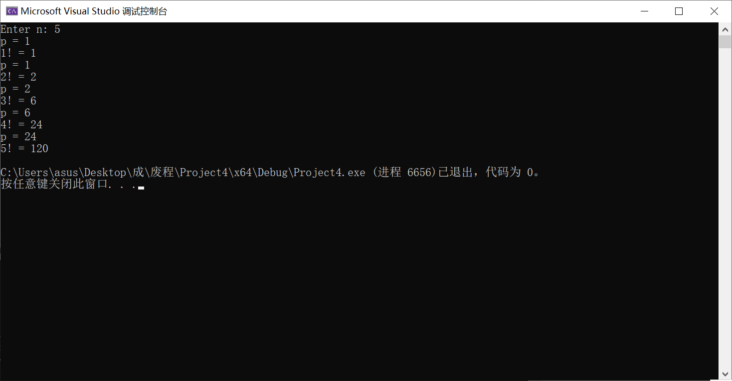 #include <stdio.h> long long fac(int n); int main() { int i, n; printf("Enter n: "); scanf("%d", &n); for (i = 1; i <= n; ++i) printf("%d! = %lld\n", i, fac(i)); return 0; } long long fac(int n) { static long long p = 1; printf("p = %lld\n", p); p = p * n; return p; }