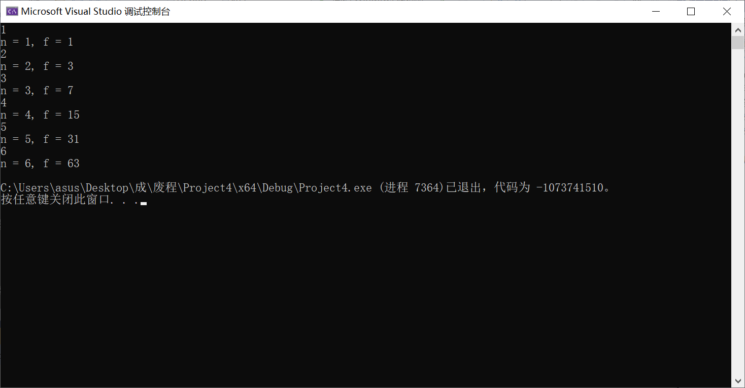 #include <stdio.h> long long fun(int n); int main() { int n; long long f; while (scanf("%d", &n) != EOF) { f = fun(n); printf("n = %d, f = %lld\n", n, f); } return 0; } long long fun(int n) { int i; long long a = 0, p = 1; if (n == 0) a = 1; else { for (i = 1;i <= n;i++) { p = p * 2; } a = p - 1; } return a; }