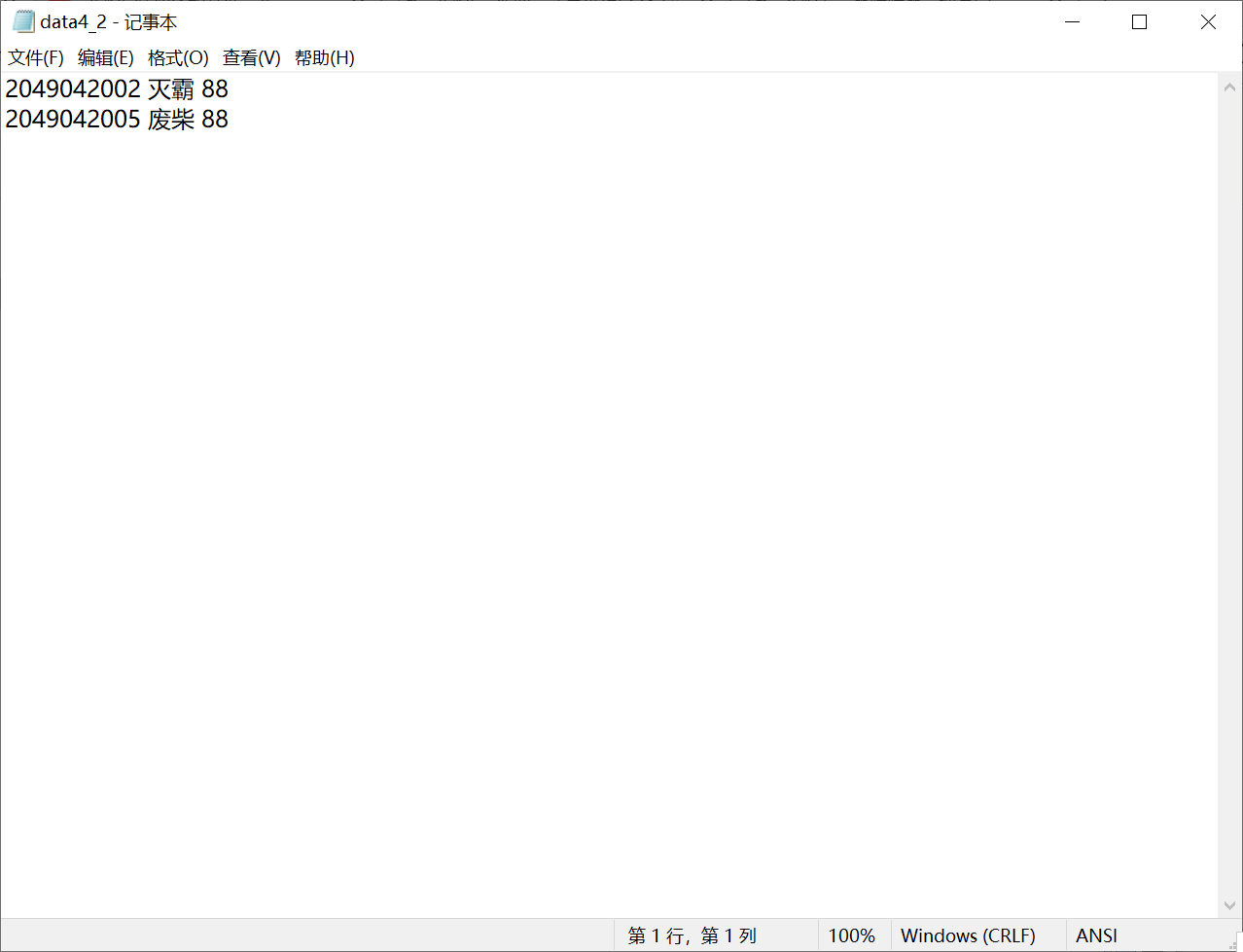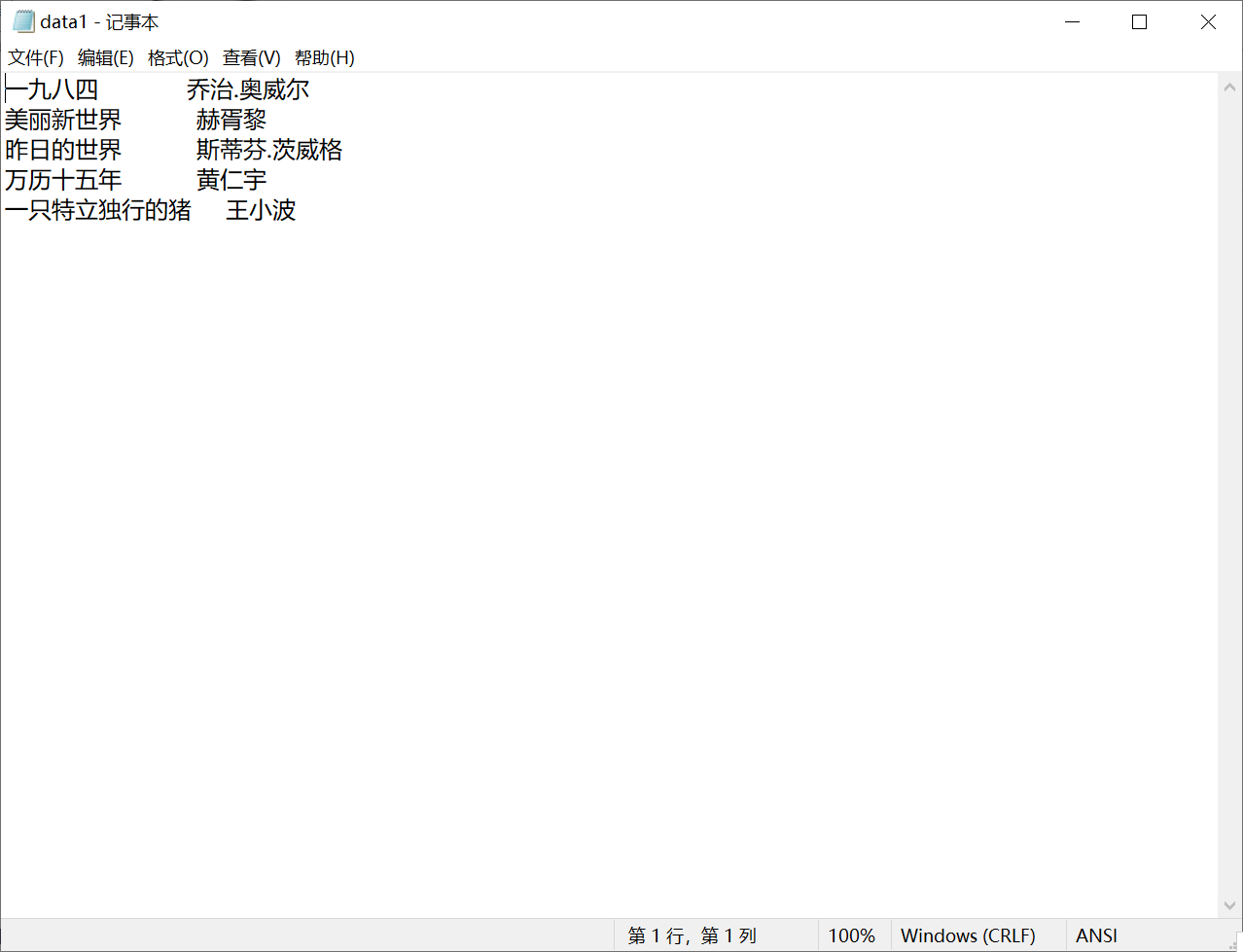 #include<stdio.h> #define N 5 #define M 80 typedef struct { char name[M]; char author[M]; }Book; int main() { Book x[N]={{"一九八四","乔治.奥威尔"}, {"美丽新世界","赫胥黎"}, {"昨日的世界", "斯蒂芬.茨威格"}, {"万历十五年", "黄仁宇"}, {"一只特立独行的猪", "王小波"} }; int i; FILE *fp; // 以写的方式打开文本文件data1.txt fp = fopen("data1.txt", "w"); // 如果打开文件失败,输出提示信息并返回 if(fp == NULL) { printf("fail to open file\n"); return 1; } // 将结构体数组x中的图书信息写到fp指向的文件data1.txt // 同时也输出到屏幕上 for(i=0; i<N; ++i) { fprintf(fp, "%-20s %-20s\n", x[i].name, x[i].author); printf("%-20s %-20s\n", x[i].name, x[i].author); } fclose(fp); return 0; }