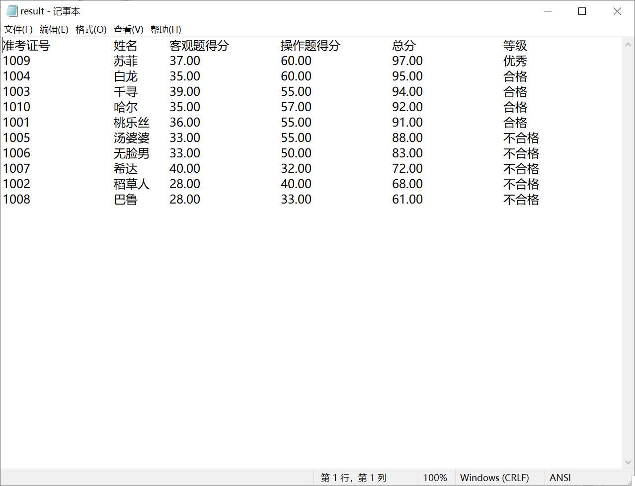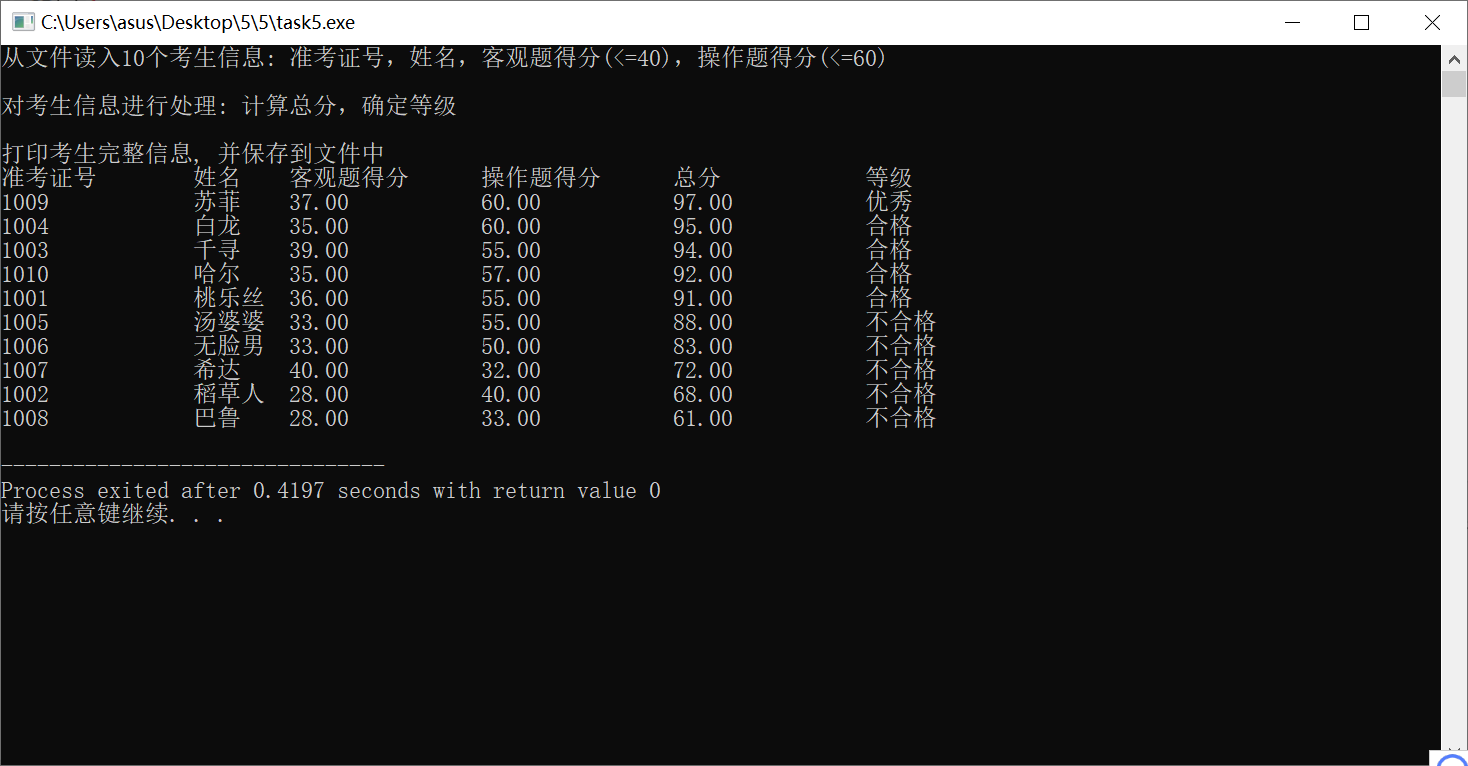#include <stdio.h> #include <string.h> #include <stdlib.h> #define N 10 typedef struct { long int id; char name[20]; float objective; /*客观题得分*/ float subjective; /*操作题得分*/ float sum; char level[10]; } STU; // 函数声明 void input(STU s[], int n); void output(STU s[], int n); void process(STU s[], int n); int main() { STU stu[N]; printf("从文件读入%d个考生信息: 准考证号,姓名,客观题得分(<=40),操作题得分(<=60)\n", N); input(stu, N); printf("\n对考生信息进行处理: 计算总分,确定等级\n"); process(stu, N); printf("\n打印考生完整信息, 并保存到文件中"); output(stu, N); return 0; } // 从文本文件examinee.txt读入考生信息:准考证号,姓名,客观题得分,操作题得分 void input(STU s[], int n) { int i; FILE *fin; fin = fopen("examinee.txt", "r"); if (fin == NULL) { printf("fail to open file\n"); exit(0); } while (!feof(fin)) { for (i = 0; i < n; i++) fscanf(fin, "%ld %s %f %f", &s[i].id, s[i].name, &s[i].objective, &s[i].subjective); } fclose(fin); } //输出考生完整信息: 准考证号,姓名,客观题得分,操作题得分,总分,等级 // 不仅输出到屏幕上,还写到文本文件result.txt中 void output(STU s[], int n) { FILE *fout; int i; // 输出到屏幕 printf("\n"); printf("准考证号\t姓名\t客观题得分\t操作题得分\t总分\t\t等级\n"); for (i = 0; i < n; i++) printf("%ld\t\t%s\t%.2f\t\t%.2f\t\t%.2f\t\t%s\n", s[i].id, s[i].name, s[i].objective, s[i].subjective, s[i].sum, s[i].level); // 保存到文件 fout = fopen("result.txt", "w"); if (!fout) { printf("fail to open or create result.txt\n"); exit(0); } fprintf(fout, "准考证号\t\t姓名\t客观题得分\t操作题得分\t总分\t\t等级\n"); for (i = 0; i < n; i++) fprintf(fout, "%ld\t\t%s\t%.2f\t\t%.2f\t\t%.2f\t\t%s\n", s[i].id, s[i].name, s[i].objective, s[i].subjective, s[i].sum, s[i].level); fclose(fout); } // 对考生信息进行处理:计算总分,排序,确定等级 void process(STU s[], int n) { int i,j; STU t; FILE *fin; fin = fopen("examinee.txt", "r"); while (!feof(fin)) { for (i = 0; i < n; i++) fscanf(fin, "%ld %s %f %f", &s[i].id, s[i].name, &s[i].objective, &s[i].subjective); } for(i=0;i<n;i++) { s[i].sum=s[i].objective+s[i].subjective; } for(i=0;i<n;i++) { for(j=i;j<n;j++) { if(s[i].sum<s[j].sum) { t=s[i]; s[i]=s[j]; s[j]=t; } } } for(i=0;i<n;i++) { if (i == 0) strcpy(s[i].level, "优秀"); else if (i >= 1 && i <= 4) strcpy(s[i].level, "合格"); else strcpy(s[i].level, "不合格"); } }
