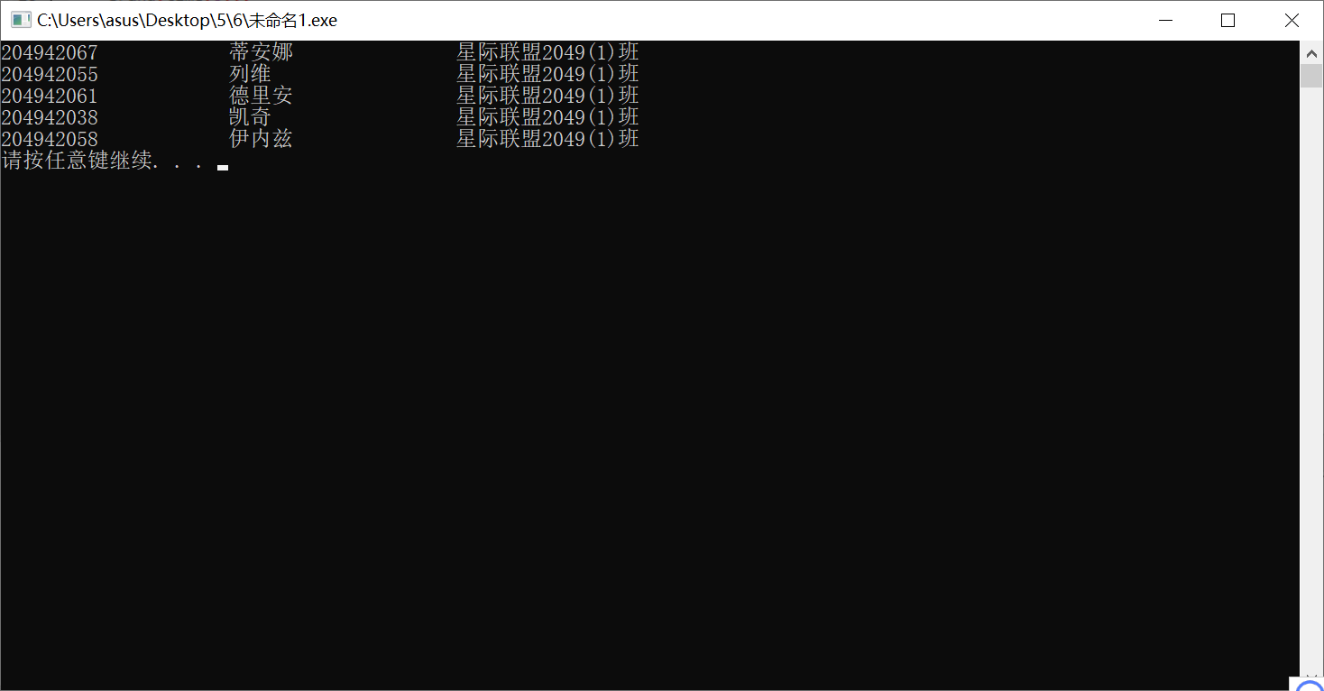 #include<stdio.h> #include<stdlib.h> #include<time.h> #define N 5 #define M 80 typedef struct { char xuehao[20]; char name[20]; char classm[20]; }lucky; int main() { int i, j; lucky s[M]; FILE* fin; FILE* fout; srand(time(0)); fin = fopen("list.txt", "r"); if (fin == NULL) { printf("fail to open file\n"); return 1; } for (i = 0; i < M; i++) { fscanf(fin, "%s %s %s\n", s[i].xuehao, s[i].name, s[i].classm); } fout = fopen("lucky.txt", "w"); if (fout == NULL) { printf("fail to open file\n"); return 1; } for (i = 0; i < N; i++) { j = rand()%(80)+1; printf("%-20s %-20s %-20s\n", s[j].xuehao, s[j].name, s[j].classm); fprintf(fout, "%-20s %-20s %-20s\n", s[j].xuehao, s[j].name, s[i].classm); } fclose(fin); fclose(fout); system("pause"); }