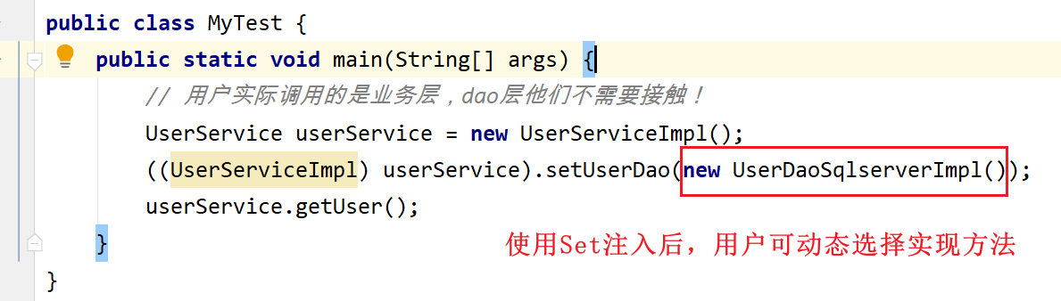 public class UserMapperImpl implements UserMapper { // 我们所有的操作,在原来都使用sqlSession来执行,现在都使用SqlSessionTemplate private SqlSessionTemplate sqlSession; public void setSqlSession(SqlSessionTemplate sqlSession) { this.sqlSession = sqlSession; } public List<User> selectUser() { UserMapper mapper = sqlSession.getMapper(UserMapper.class); return mapper.selectUser(); } } -
