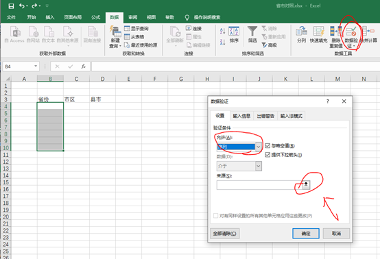 4. 创建如下表格后,点击数据验证,选择“序列”后,在“来源”中选择省份区域。
