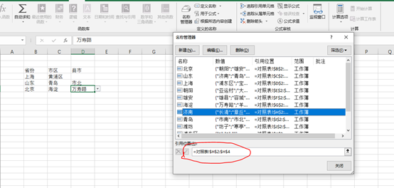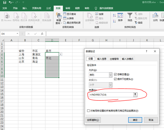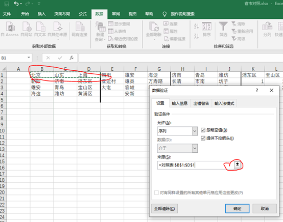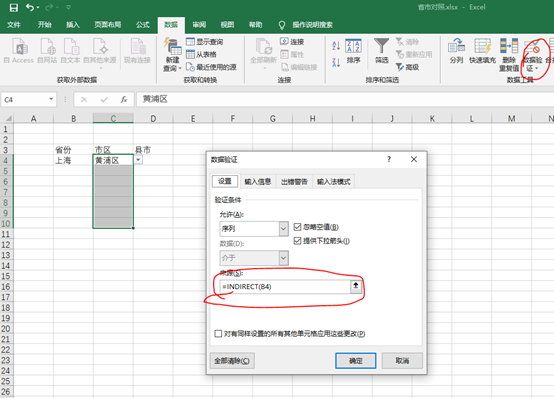 5. 选中市区下方内容,点击“数据验证”。填写如下内容。
