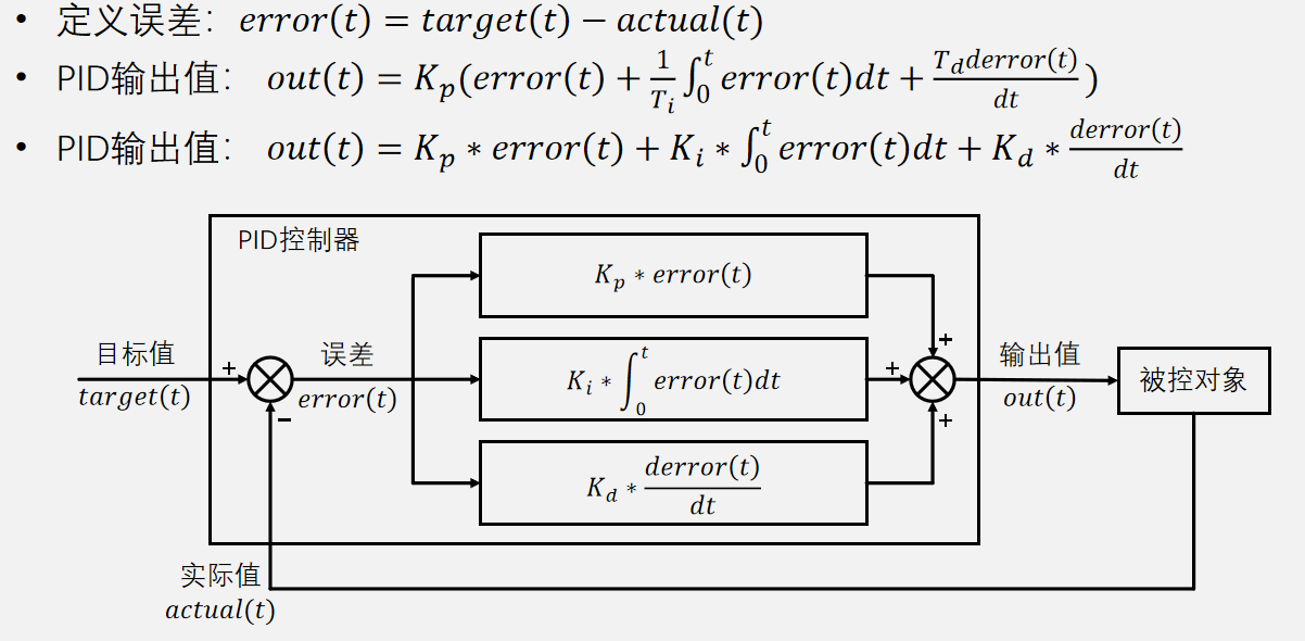 - PID是一种基于误差(Error)调控的算法,其中规定:误差=目标值-实际值,PID的任务是使误差始终为0