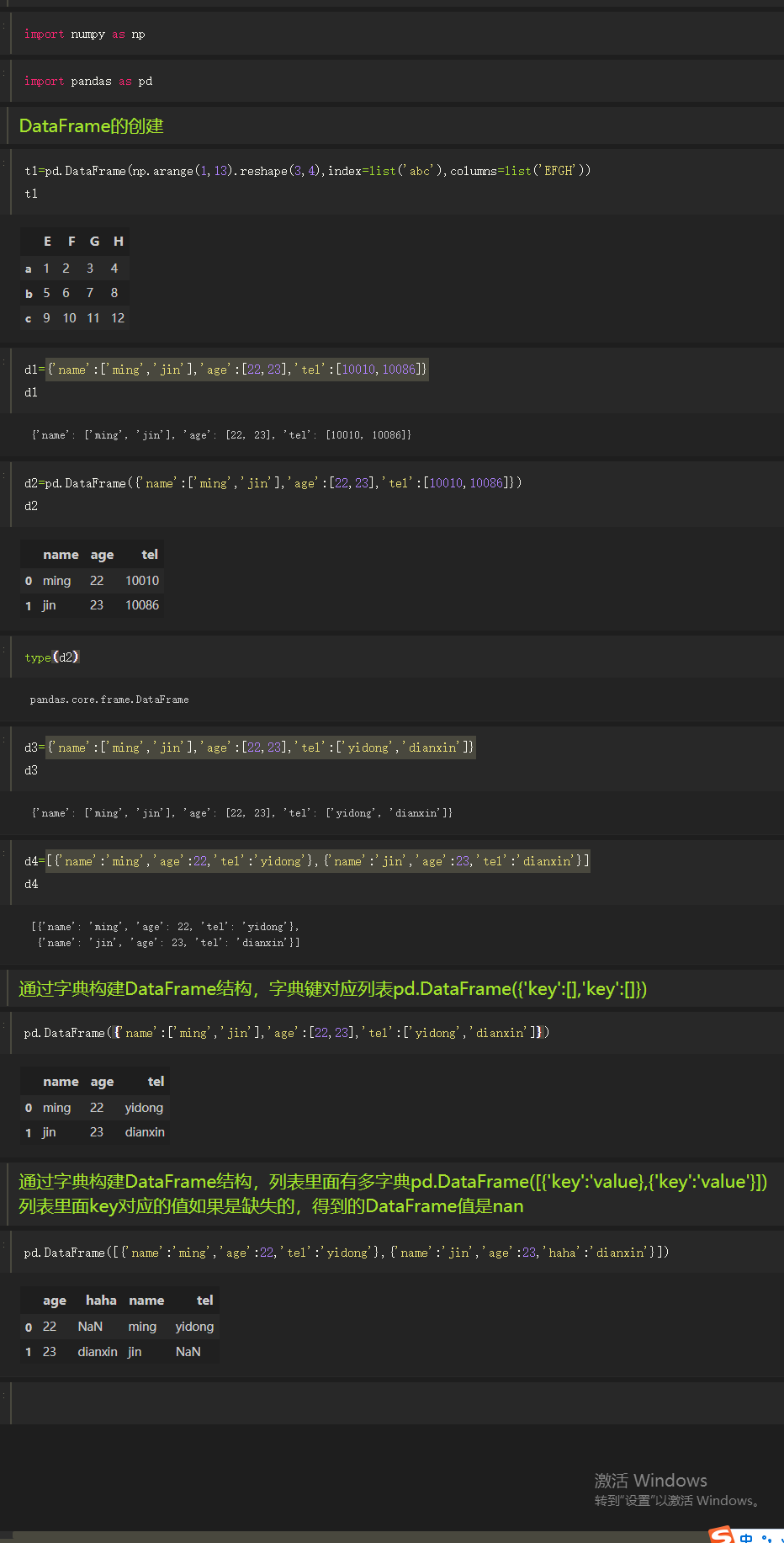 DataFrame的创建,index,columns,字典列表,列表字典的创建
