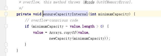 minimumCapacity是使用长度+传入字符串长度的总和,如果现有数组的长度小于mininumCapacity,那么就对数组进行扩容。