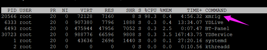 1.top命令第一栏就是PID,缺点就是程序多不好找。我这里主要是因为xmrig占用CPU高,用top方便。
