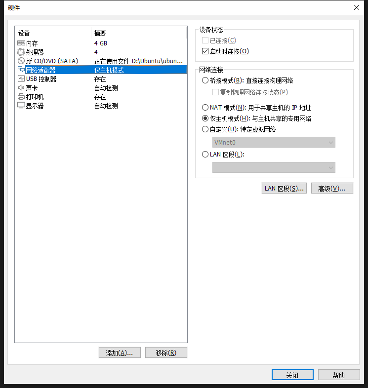 - 我看网上很多都是仅主机模式,我设置成NAT才能用网
