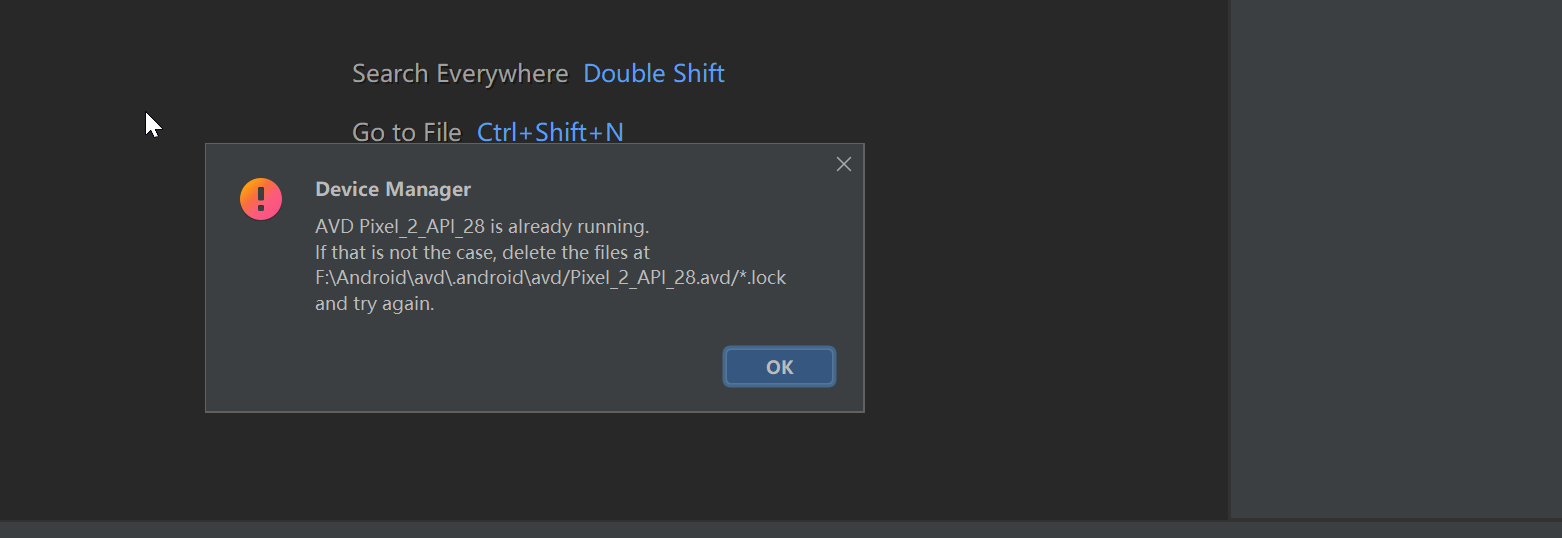 当我们再次启动模拟器的时候提示我们已经有一个模拟器在启动中但是我们并没有看到呀