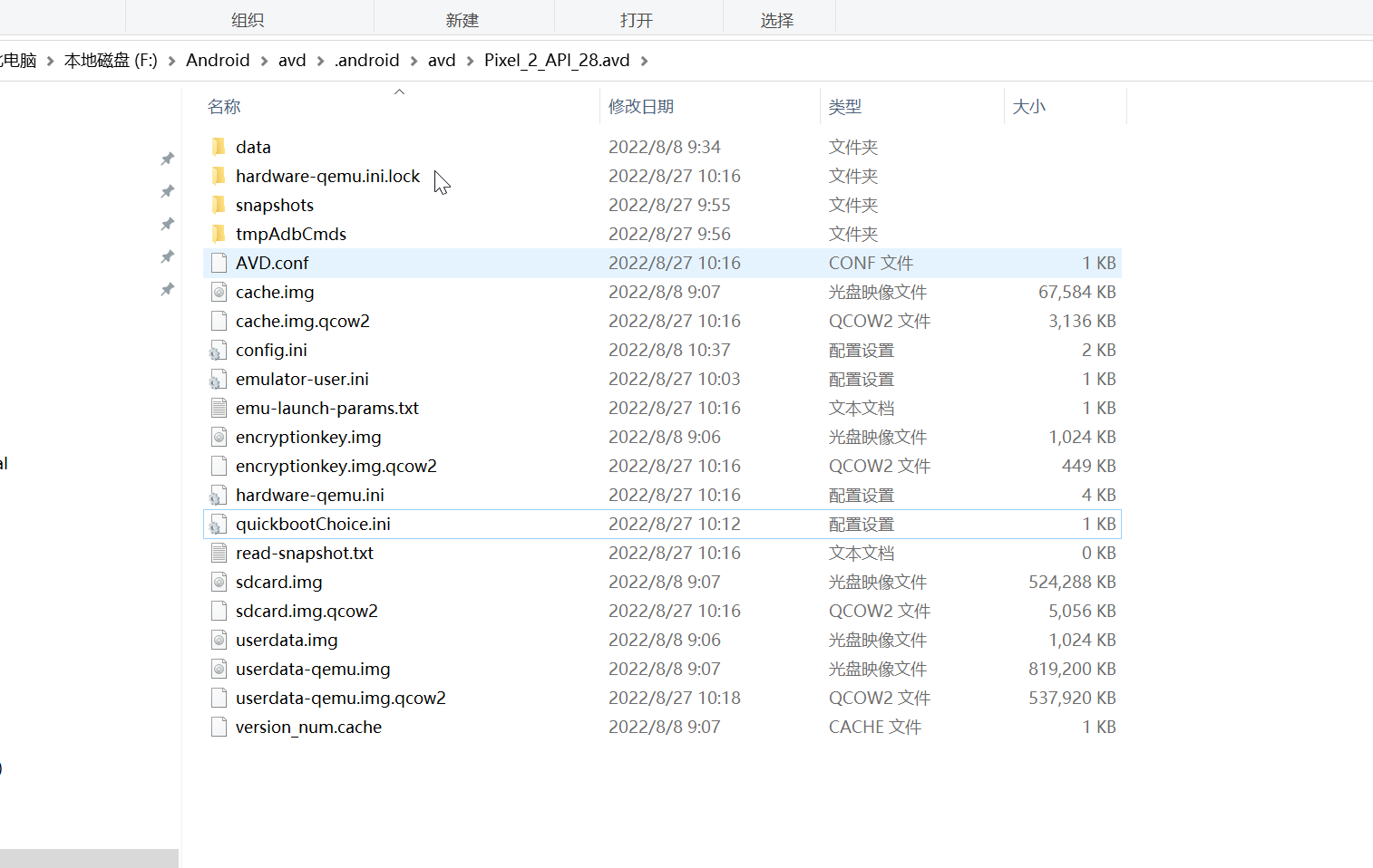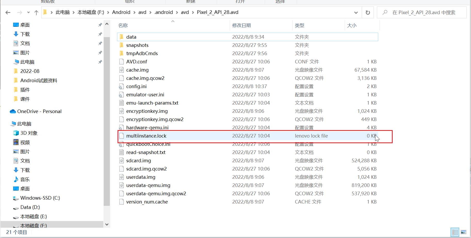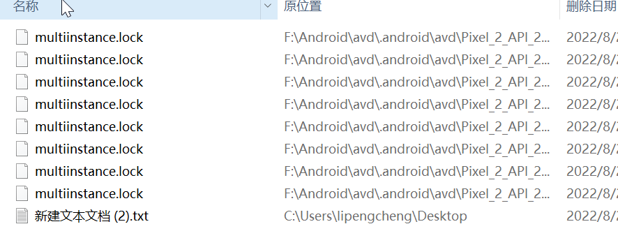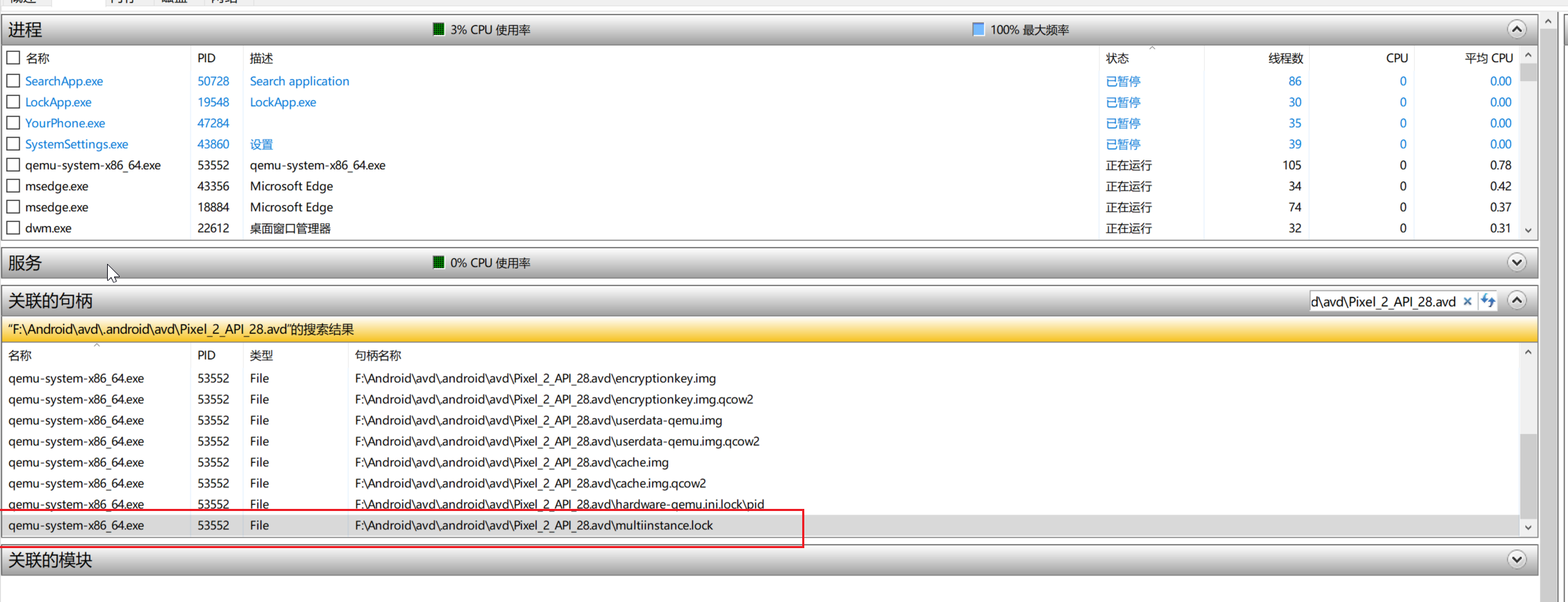 那么我们将这个文件夹的路径复下来然后打开任务管理器这里是我的路径 F:\Android\avd\.android\avd\Pixel_2_API_28.avd