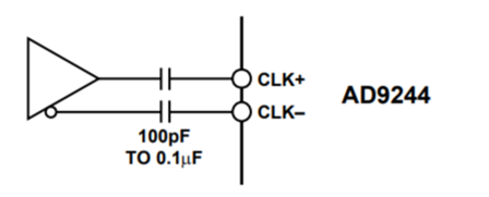 1)时钟采用差分的方式驱动。由于时钟信号和ADC的输出信号在一根排线内,ADC输出的并行数据会对时钟产生十分严重的影响,因此用差分的方式传输时钟。差分时钟在控制板上分别由FPGA和AD9517产生,在调试时做二选一,用于验证两种时钟对采样时序以及信噪比的影响。时钟与ADC的连接方式如图8所示:由于控制板产生的时钟信号为LVDS,因此在AD9244时钟输入端做交流耦合即可。