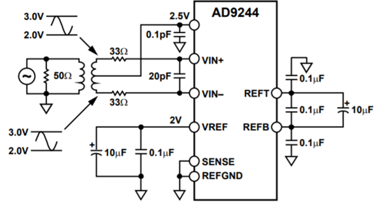 VIN+,VIN-:模拟信号输入端。采用单输入形式时,在VIN+端接输入信号,VIN-端接地;采用差分形式输入模拟信号时,VIN+,VIN-分别接差分信号的两端。差分输入的形式对于高精度高速度的应用更容易获得好的效果。一般情况下,输入信号都是单路形式,因此经常采用1:1变压器或者专用差分转换芯片来实现单路信号到差分信号的转换。