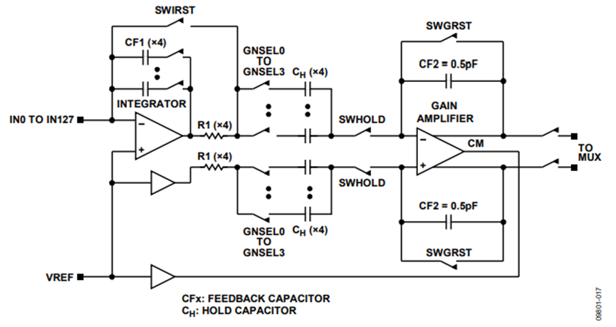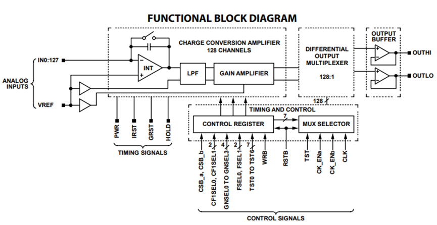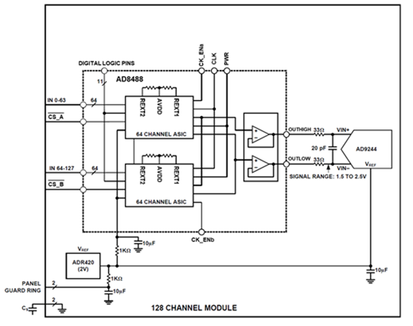 AD8488是一款128通道模拟前端,为高性能数字X射线系统而设计。它的模拟通道由一个积分器和增益可选的单端转低阻抗差分输出组成。该模拟通道将X射线或光电二极管检波器收集的电荷转换成电压信号。通道由CMOS晶体管组成,这些晶体管采用典型高输入阻抗的CMOS门。该设备的积分器采用一系列可选电容值,产生与电荷有关的电压,可适应广泛的输入电荷值。单端输入转差分输出电压放大器位于积分器之后,在这里偏移和低频噪声电压从输入电压中减去。一条128:1通道差分MUX位于缓冲器之后,驱动模拟输出缓冲。同时还提供开关驱动器和某些数字计时功能;这些功能全部集成在255引脚BGA基板上。全部128通道的电荷转换是同步进行的,之后便采用7位地址编码生成顺序电压输出读数。一共两次序列,对全部128通道进行采样。逻辑控制输入CS_A和CS_B分别选择通道地址的下限和上限64模块。