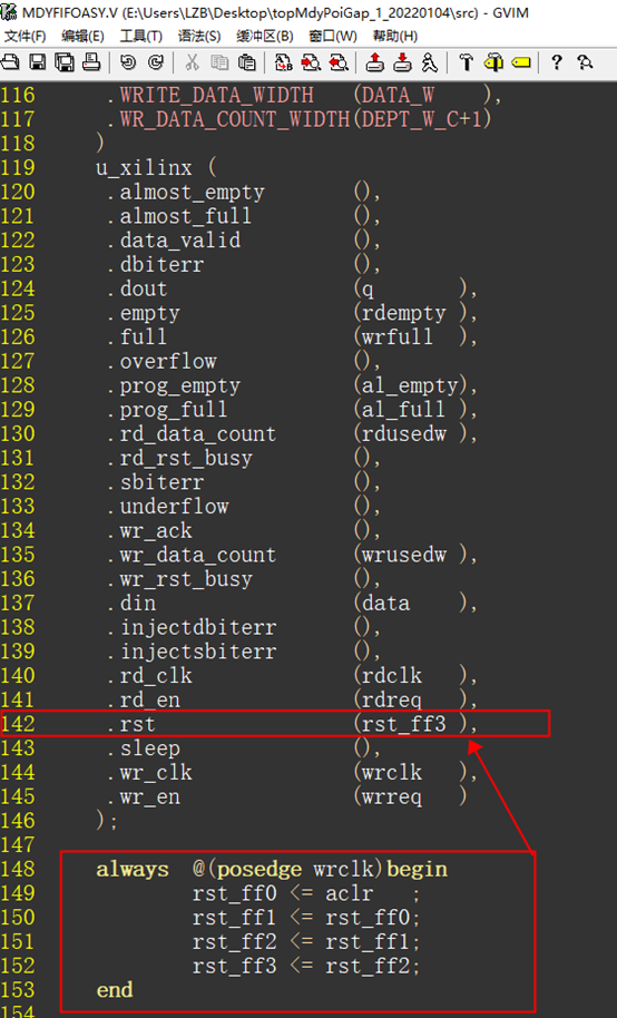 上图中,aclr是异步复位信号,经过上图中的148~153行的代码,将该信号同步化,同步化后的rst_ff3可以认为同步于写时钟。将该信号连接到rst中,如图中的第142行。