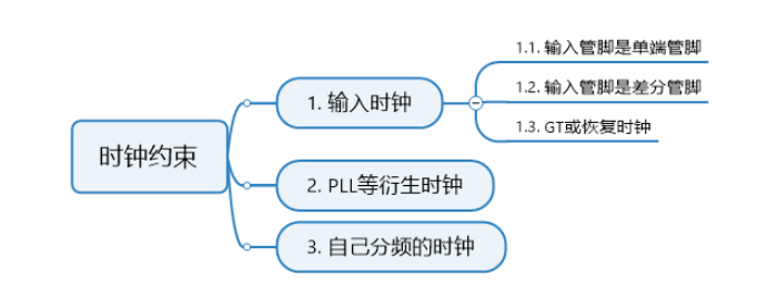 如上图,时钟约束概括地,可以分成三种情况,分别是输入时钟、PLL等衍生时钟以及自己分步的时钟。