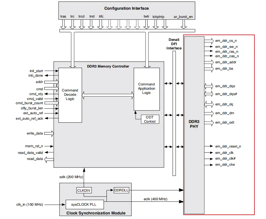 与设计SDRAM接口不同的是,我们在使用DDR3时,是不需要我们亲自设计这些输出信号, 因为我们调用的DDR3 IP核已经帮我们内部封装好了这些指令,我们需要设计的是输入IP核的那部分接口信号,来告诉IP核我们想让DDR3进行工作的模式以及需要DDR3进行的操作。在设计这个接口模块的时候,我们需要设计的就是图1左侧接口的那部分信号,各信号的功能以及时序在数据手册上有详细的说明(在我前面的文章中也有详细的介绍),这需要我们一边对照着数据手册一边进行设计,具体的设计方法我将会在接下来的文章中继续介绍。