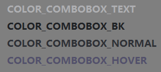 #define COLOR_COMBOBOX_TEXT RGB(174, 175, 178) #define COLOR_COMBOBOX_BK RGB(32, 34, 37) #define COLOR_COMBOBOX_NORMAL RGB(47, 49, 54) #define COLOR_COMBOBOX_HOVER RGB(83, 81, 107)