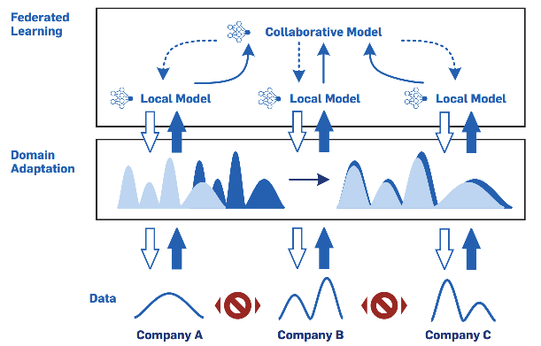 实现跨公司AI技术的一种直接方式是通过数据共享构造大规模的跨公司数据集。但出于数据保密和隐私泄漏风险的考虑,大多数公司都不愿意直接共享数据。并且在大多数情况下,共享数据受到隐私相关法律的限制。因此,具有领域自适应的联邦学习是解决跨公司AI问题的关键,一方面,联邦学习能够在不泄漏各公司数据隐私的前提下,实现模型训练和推理;另一方面,领域自适应允许各公司按照自己特定的应用场景和条件,对联邦模型做定制。