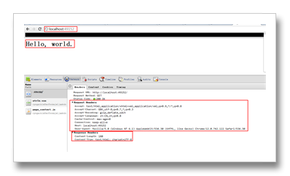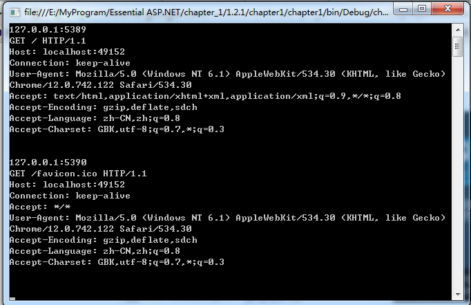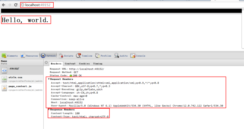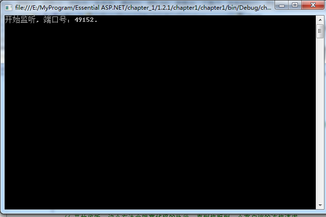 public void Run() { // 取得本机的 loopback 网络地址,即 127.0.0.1 IPAddress address = IPAddress.Loopback; // 创建可以访问的端点,49152 表示端口号 IPEndPoint endPoint = new IPEndPoint(address, 49152); // 创建一个 socket,使用 IPv4 地址,传输控制协议 TCP,双向、可靠、基于连接的字节流 Socket socket = new Socket( AddressFamily.InterNetwork, SocketType.Stream, ProtocolType.Tcp); // 将 socket 绑定到一个端点上 socket.Bind(endPoint); // 设置连接队列的长度 socket.Listen(10); Console.WriteLine("开始监听, 端口号:{0}.", endPoint.Port); while (true) { // 开始监听,这个方法会阻塞线程的执行,直到接受到一个客户端的连接请求 Socket client = socket.Accept(); // 输出客户端的地址 Console.WriteLine(client.RemoteEndPoint); // 准备读取客户端请求的数据,读取的数据将保存在一个数组中 byte[] buffer = new byte[4096]; // 接受数据 int length = client.Receive(buffer, 4096, SocketFlags.None); // 将请求的数据翻译为 UTF-8 System.Text.Encoding utf8 = System.Text.Encoding.UTF8; string requestString = utf8.GetString(buffer, 0, length); // 显示请求的内容 Console.WriteLine(requestString); // 状态行 string statusLine = "HTTP/1.1 200 OK\r\n"; byte[] statusLineBytes = utf8.GetBytes(statusLine); // 准备发送到客户端的网页 string responseBody = @"<html> <head><title>From Socket Server</title></head> <body><h1>Hello, world.</h1></body> </html>"; byte[] responseBodyBytes = utf8.GetBytes(responseBody); // 回应的头部 string responseHeader = string.Format( "Content-Type: text/html; charset=UTF-8\r\nContent-Length: {0}\r\n", responseBody.Length ); byte[] responseHeaderBytes = utf8.GetBytes(responseHeader); // 向客户端发送状态信息 client.Send(statusLineBytes); // 向客户端发送回应头 client.Send(responseHeaderBytes); // 头部与内容的分隔行 client.Send(new byte[] { 13, 10 }); // 向客户端发送内容部分 client.Send(responseBodyBytes); // 断开与客户端的连接 client.Close(); if (Console.KeyAvailable) break; } // 关闭服务器 socket.Close(); }运行效果如下: