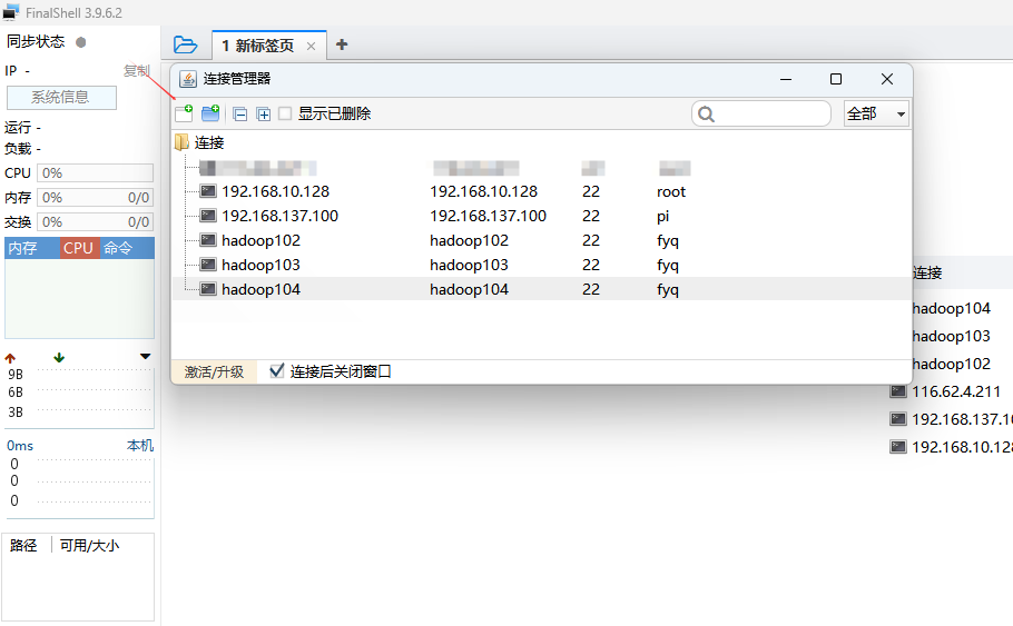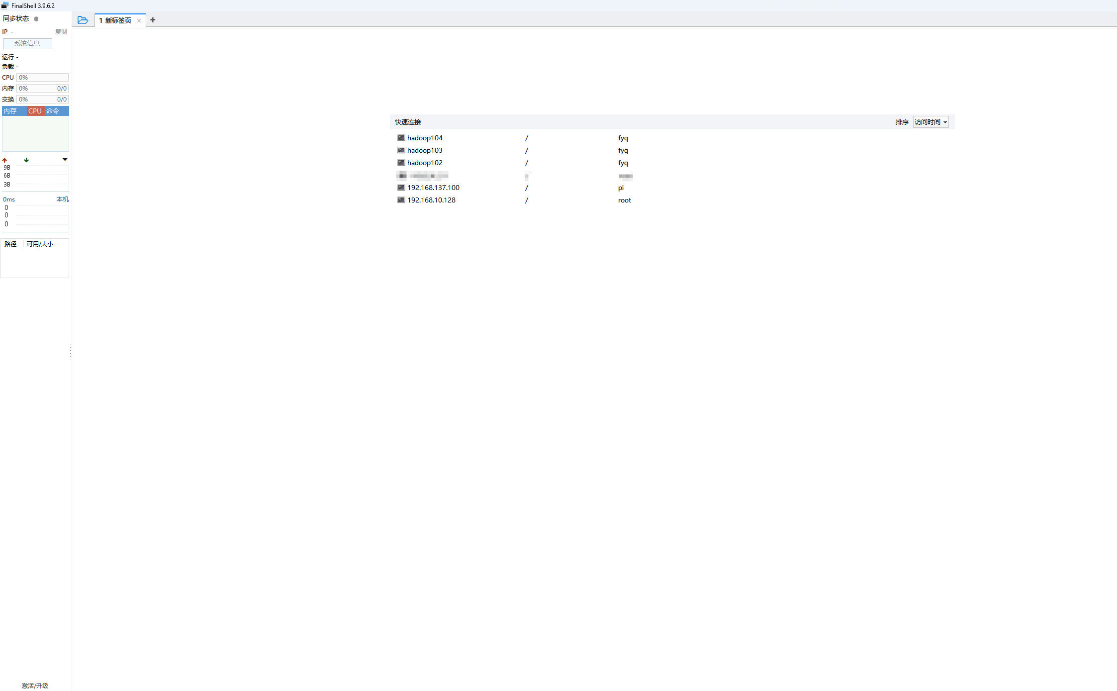 此界面就是finalshell主界面,可以看到我这里有六台虚拟机的连接记录