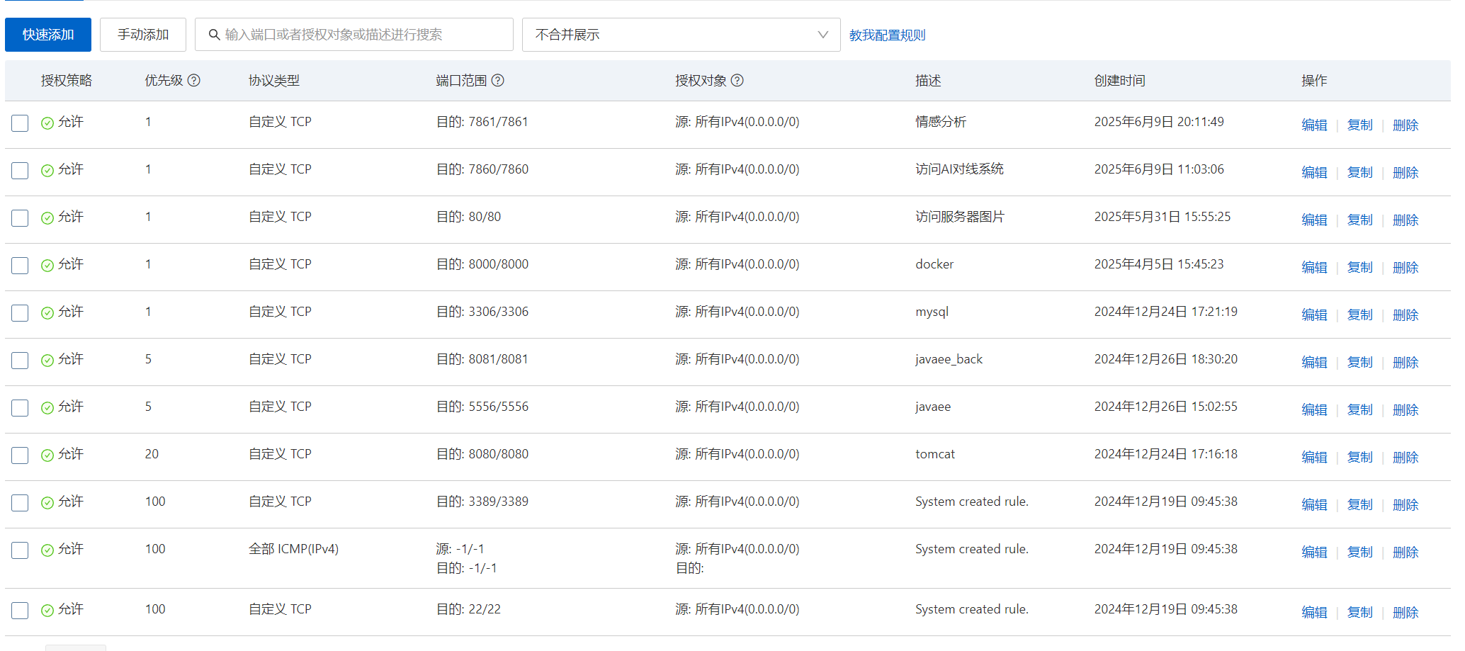 确保服务器端口能够正常访问,例如SpringBoot中默认8080端口,Gradio默认7860端口,这些如果说想部署到服务器且要其他人使用,必须得开放这些端口